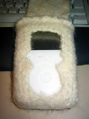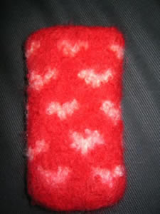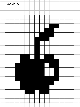 Työn koko ennen huovutusta: pussiosan leveys 11 cm ja korkeus 18 cm. Läpän leveys n. 11 cm ja korkeus 25 cm. Luo 30 silmukkaa valkoisella. Neulo suljettuna neuleena sileää, kunnes putken korkeus on 18 cm. Päätä 17 s. Neulo sileää jäljelläolevalla 13 silmukalla, kunnes läpän pituus on 20 cm. Aloita kavennukset. Kavenna joka toinen kerros molemmissa sivuissa reunasilmukan sisäpuolella 1 s. Jatka kavennuksia, kunnes jäljellä on 5 s. Neulo keskimmäiset 3 s yhteen, katkaise lanka ja vedä lanka kaikkien silmukoiden läpi. Kiristä. Päättele langanpätkät ja ompele alaosa kiinni. Virkkaa rivi ketjusilmukoita läpän ympäri. (Läpän pituus on ennen huovutusta n. 25 cm ja pussiosan 20 cm). Ompele silmukoita jäljittelemällä takaosaan kaavion A mukainen omena punaisella. Huovuta. Huovutuksen jälkeen venyttele kotelo muotoihinsa. Läpän kärkiosan pitäisi ulottua kotelon alle. Leikkaa kotelon eteen aukko, josta näet näytön ja valintapyörän. Aukko voi olla neliskulmainen tai mukailla etupanelin kuviointia. Käy aukon reunat läpi sormin vedessä, käytä tarvittaessa apuna saippuaa. Tärkoituksena on tiivistää aukkoa, jotta se ei hapsota. Kuivumisen jälkeen kiinnitä läppä koteloon haluamallasi menetelmällä (esim. tarranauhalla). Tarvittaessa voit laittaa kotelon reunaan kuminauhaa jotta suu pysyy mahdollisimman kiinni ja tiukasti soittimen ympärillä. Huom: kotelon voi neuloa avoimena neuleenakin. Ompele siinä tapauksessa reuna kiinni ennen huovutusta. Yritä pitää sauma mahdollisimman tasaisena, eli ei mitään yhden silmukan saumanvaroja, muuten sauma jää paksummaksi huovutuksen jälkeen. Tee kuitenkin kotelo sileänä neuleena. Kuvion ompeleminen on helpompaa. Läpällinen malli: lyhyt läppäNeulotaan muuten samoin kuin pitkäläpällinen malli, paitsi aloita läpän kavennukset, kun olet neulonut suoraa 11 cm. Sydänkuvoinen pussukka