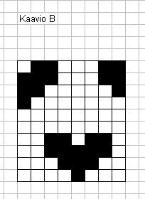 Pussukasta on tarkoitus tehdä parisen senttiä pidempi kuin soittimesta. Voit neuloa kumman väriset sydämet haluat. Luo 32 s pohjavärillä ja neulo suljettuna neuleena sileää pohjavärillä 4 krs. Aloita kirjoneule kaavion B mukaan. Mallikerrassa on 12 kerrosta. Toista mallikertaa 2,5 kertaa (viimeinen on siis kerros 6) tai kunnes pussin pituus on n. 20 cm (jos kuviot menevät tasan). Neulo tämän jälkeen yksi kerros nurjaa ja päätä silmukat. Ompele alaosa kiinni ennen huovutusta. Huovutuksen jälkeen sovita soittimen ympärille (kannattaa käyttää muovipussia välissä) ja venyttele muotoonsa. Kun kotelo on kuivunut, kiinnitä pussukan suuhun valitsemasi kiinnitys