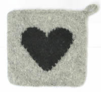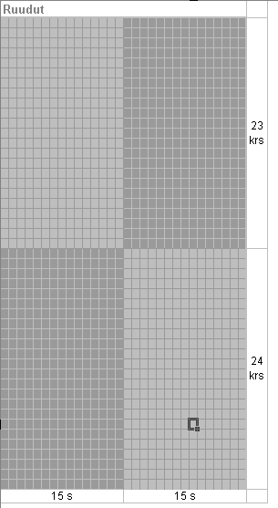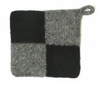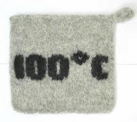 HuovutuksestaHuopumiseen vaikuttavat esimerkiksi neulojan käsiala, huovutuslämpötila, huovutusaika, koneeseen huovutettavan työn kanssa samanaikaisesti laitettavat vaatteet ja pesukoneen ominaisuudet. Myös saman langan eri värisävyt voivat huopua eri tavoin. Kaikista näistä tekijöistä johtuen alla oleva ohje on vain suuntaa-antava. Jos haluat olla etukäteen varma työn lopullisesta koosta, huovuta ensin mallitilkku ja laske sen perusteella tarvittava silmukkamäärä patalapullesi. OhjeNeulo jokaisen krs:n viimeinen silmukka nurin ja nosta jokaisen kerroksen ensimmäinen silmukka oikein neulomatta, jotta saat työhön siistit reunat. Sydän ja 100 ºCLuo työhön 31 silmukkaa. Ensimmäinen neulottava krs = oikean puolen krs eli neulo ensimmäinen krs oikein. Neulo sileää yhteensä 47 krs. Päättele työ 48. krs:lla. Leikkaa lanka poikki reilun metrin päästä, taita lanka kaksinkerroin ja virkkaa noin 10 cm:n mittainen ripustuslenkki patalapulle. Virkkaa lenkki kiinni patalappuun piilosilmukalla. Ompele haluamasi kuvio työhön silmukoita jäljitellen ruutupiirroksen osoittamaan paikkaan. Päättele langanpäät nurjalle. RuudutLuo 15 silmukkaa toisella värillä ja heti perään 15 silmukkaa toisella värillä. Neulo 1. krs oikein tällä väriyhdistelmällä ja jatka samalla väriyhdistelmällä puoleen väliin patalappua eli yhteensä 24 krs:n ajan. Vaihda sitten värien paikkaa ja neulo uudella väriyhdistelmällä 23 krs:n ajan. Päättele työ 48. krs:lla. Tee ripustuslenkki ja päättele langanpäät kuten edellä. HuovutusKostuta työ ja muotoile se mittojen mukaiseksi. Huovuta sitten pesukoneessa 40 ºC:ssa noin 1,5 tunnin ajan normaalissa pesuohjelmassa. Laita koneeseen patalapun lisäksi esim. parit farkut ja pesuainetta, jotta työ huovuttuu paremmin. Älä laita koneeseen mitään, mistä lähtee nukkaa. Älä myöskään laita sekaan mitään väriäpäästävää, jos huovutat vaaleita värejä. Kun olet huovuttanut työn, kostuta työtä tarvittaessa lisää ja venytä muotoonsa. Anna kuivua vaakatasossa esim. pyyhkeen päällä. Jos työ ei huopunut ensimmäisessä pesussa tarpeeksi, huovuta se uudestaan joko 40 ºC:ssa tai 60 ºC:ssa riippuen siitä, kuinka hyvin työ huovuttui ensimmäisessä pesussa. Jos työ huovuttui huonosti 40 ºC:ssa (koko ei muuttunut paljoakaan ja/tai silmukat näkyvät pinnasta vielä hyvin selkeästi), kannattaa valita lämpötilaksi suoraan 60 ºC. HoitoKattilasta tuleva vesihöyry saattaa käpristää patalappua. Voit kostuttaa patalapun kevyesti ja venyttää sen takaisin muotoonsa. Anna kuivua vaakatasossa. Patalappua voi myös silittää villalämpötilalla, mutta tällöin patalapun pinta menettää kuohkeutensa ja lopputulos on hieman ”peltisempi”. Ero ei ole kuitenkaan huomattava, joten tämä vaihtoehto kannattaa ehkä valita, jos jostakin syystä keksii parempaakin tekemistä kuin käpristyneiden patalappujen venyttelemisen...! Patalapun voi pestä käsin tai koneen käsinpesuohjelmassa