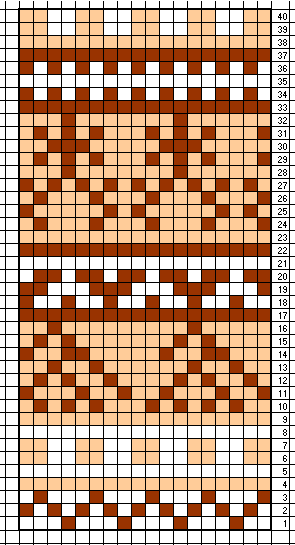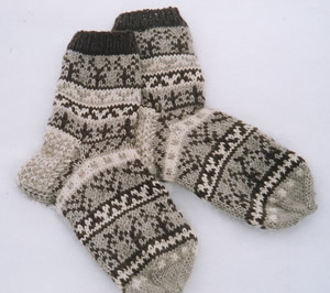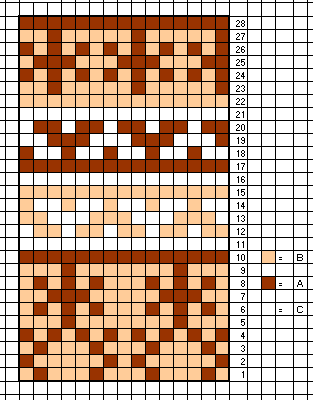 OhjeVarsiLuo 44 silmukkaa 4 sukkapuikolle (11 kullekin) ja neulo värillä A 1 o, 1 n –resoria 8 kerrosta. Resorin jälkeen lisää joka puikolle yksi silmukka samalla, kun aloitat sileän oikean neuloksen värillä B (=silmukoita sen jälkeen yhteensä 48). Aloita kuviokerrokset heti tämän yhden sileän kerroksen jälkeen (Kaavio 1). Varren jälkeen aloita kantapään neulominen: Kantatilkku ja kantapääNeulo värillä C 1. puikon ja 4. puikon silmukat yhdelle puikolle. Neulo kaavion 2 mukaan 22 kerrosta oikealla puolella oikeaa, nurjalla nurjaa. Aloita sen jälkeen kantapään neulominen (aloita se ollessasi sukassa nurjalla puolella ja neulo yhdellä värillä, värillä B). Neulo nurjaa kunnes puikolla on jäljellä 7 silmukkaa. Neulo 2 nurin yhteen ja käännä työ, ja jatka neulomista oikealla puolella siten, että nostat siellä neulomatta ensimmäisen silmukan (sen, johon teit juuri kavennuksen). Neulo oikealla puolella taas kunnes puikolla on 7 silmukkaa, ja neulo 2 oikein yhteen. Käännä työ ja nosta nurin neulomatta ensimmäinen silmukka. Neulo kunnes puikolla on 6 silmukkaa ja neulo 2 nurin yhteen. Käännä jne. jatka näin kunnes kaikki kantalapun sivusilmukat on neulottu loppuun. Viimeinen kerros neulotaan työn oikealla puolella. TeräKun kantalapun sivusilmukat ovat loppu, poimi kantalapun sivuista 12 silmukkaa kummastakin reunasta. Neulo värillä B yksi kerros sileää kaikilla silmukoilla ja aloita sen jälkeen kuvio kaavion 3 mukaan. Kavenna samalla 1. puikon lopussa (2 oikein yhteen) ja 4. puikon alussa (ylivetokavennus) kunnes silmukoita on kaiken kaikkiaan yhteensä 52. Kun olet neulonut kaavio 3:n 38. kerroksen (tai jalan koon mukaan: kun pikkuvarvas on peittynyt), aloita kärkikavennukset siten, että neulot jokaisen puikon lopussa 2 oikein yhteen kunnes joka jokaisella puikolla on 2 silmukkaa. (Kun kaavion ohje loppuu, jatka sileän oikean neulomista värillä B). Katkaise lanka. Pujota langan pää neulalla silmukoiden läpi ja kiristä. Päättele langanpäät. Neulo toinen sukka samalla tavalla. KaaviotKaavio 1