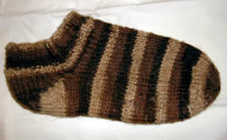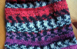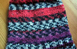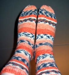 (Kuvien sukkalanka Supersocke) Langat ovat yleensä aika riittoisia. 100 g:sta lankaa tulee hyvin naisten sukat kokoa 39 ja yli jää vielä tarpeeksi esim. pieniin lasten sukkiin tai muuhun pieneen. Kokeiltuani erinäisiä itseraidoittuvia sukkalankoja voin sanoa, että ne ovat hauska ja helppo tapa saada vaihtelua sukkiin, mutta ne eivät sovi liian kriittisille ihmisille: sukista tulee samanlaiset, mutta ei välttämättä identtiset eikä täydelliset. Lankoja