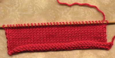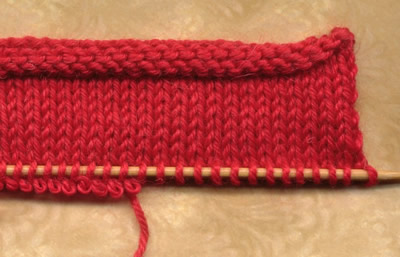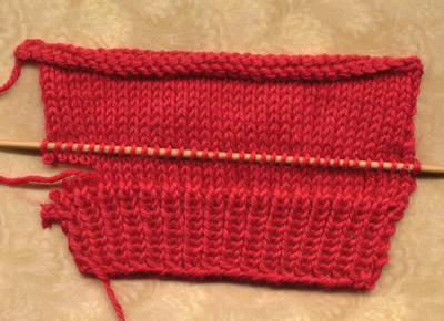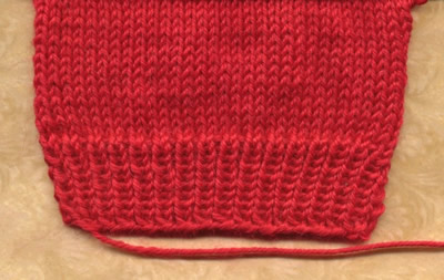 Nyt voit purettua langanpäätä vetämällä purkaa myös ylimääräisen kerroksen puikolla olevien silmukoiden alapuolelta. Kun lankaa ei ole katkaistu purkuvaiheessa, se on riittävän pitkä. Voit toki lyhentää sitä hieman, jos langanpää häiritsee, mutta älä jätä sitä aivan lyhyeksi, jotta sen pystyy ainakin päättelemään. Jatka neulomista