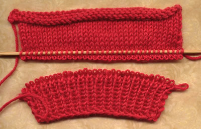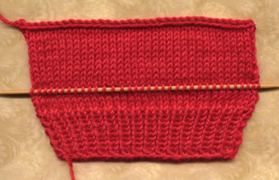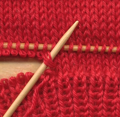 Jos haluat pidentää: pujota puikko resorista laskien 4. kerroksen silmukoille siten, että puikolle tulee silmukan oikeanpuoleinen reuna. Resorin ja jatkokohdan väliin kannattaa jättää 3 kerrosta, jotta purkaminen on helpompaa. Jos haluat lyhentää: pujota puikko haluamaasi kohtaan eli kohtaan, josta haluat resorin alkavan lyhennetyssä mallissa (eli ylemmäksi). Pujota puikko samalla tavalla kuin edellä: puikolle tulee silmukan oikeanpuoleinen reuna. Katkaise lanka