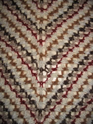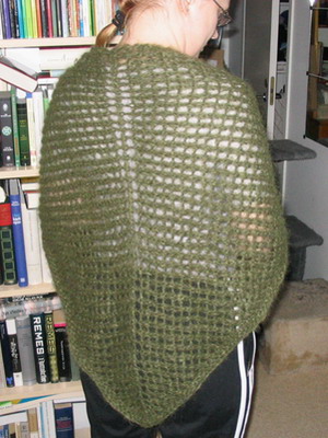 Raidalliseen huiviin on käytetty kuutta erilaista mystistä mohairlankaa varastoista (ei vyötteitä) ja siinä kavennustavat on vaihdettu keskenään: ennen keskikohtaa tein ylivetokavennuksia ja keskikohdan jälkeen yhteenneulomiskavennuksia.