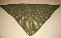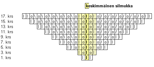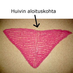 .Mallineule on yksinkertainen, kunhan sen ensin oivaltaa. Kun silmukoita on tarpeeksi (jo 3. krs jälkeen), neuleen keskimmäiset silmukat neulotaan 1o, lk, 1o, lk, 10 (keskimmäinen silmukka lihavoitu). Huomaa myös, että ennen keskisilmukkaa tehdään yhteenneulomiskavennus (neulo 2o yhteen) ja keskisilmukan jälkeen ylivetokavennus (nosta 1s neulomatta, 1o, nosta neulomatta nostettu s neulotun s:n yli). Luo 3 s kaksinkertaisella Kid Mohairilla. Jatka kaksinkertaisella langalla huivin loppuun. 1. ja 2. krs: 3o 3. krs: 1o, lk, 1o, lk, 1o 4. krs ja kaikki parilliset kerrokset: nurin, paitsi neulo kerroksen 2 ensimmäistä ja viimeistä silmukkaa oikein. 5. krs: *1o, lk*, toista *-* yht. 4. krt, 1o 7. krs: 2o, lk, yhteenneulomiskavennus (yn), lk, 1o, lk, ylivetokavennus (yv), lk, 2o 9. krs: 2o, lk, yn. *lk, 1o*, toista *-* yht. 3 krt, lk, yv, lk, 2o 11. krs: 2o, lk, *yn, lk*, 1o, lk, 1o (keskimmäinen silmukka), lk, 1o, *lk, yv*, lk, 2o 13. ja seuraavat parittomat kerrokset: Toista *-* välistä osuutta, kunnes puikolla on keskisilmukkaa edeltävä silmukka. Neulo ne ohjeen mukaan (1o, lk, 1o, lk, 1o) ja jatka kerros loppuun. Muista vaihtaa kavennustapaa keskikohdan jälkeen! Jatka, kunnes huivi on 167 s leveä. Neulo 2 krs oikein. Päättele. Kaavio