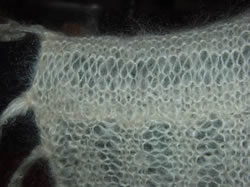 Tee molemmat kappaleet seuraavasti: Luo 54 s puikoille 5. Neulo 4 krs oikeaa. *Neulo 2 krs o puikoilla 10, neulo 6 krs o puikoilla 5*. Toista *-*. Päätä s:t, kun kpl:n korkeus on n. 75 cm. Huomaa, että päättely tehdään pienemmillä puikoilla! Päätä siis siinä vaiheessa, kun viimeisenä on pienemmillä puikoilla tehty krs. Ei ole niin vakavaa, jos kpl ei ole aivan täsmälleen 75 cm korkea, tärkeämpää on, että molemmat kappaleet ovat samankokoisia. Kun molemmat kpl:t ovat valmiit, ompele ne kulmittain yhteen. Lisää halutessasi hapsut reunoihin.