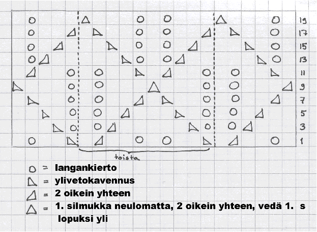 OhjeLuo 61 silmukkaa ja neulo yksi kerros oikein (np). Aloita heti seuraavalla kerroksella kuvio kaavion mukaan. Aloita kuvio aivan oikeasta reunasta (kuvion 6 ensimmäistä silmukkaa ovat reunasilmukoita, samoin kuin 5 viimeistä) ja neulo keskellä olevaa katkoviivoin erotettua toistettavaa osaa 5 kertaa ja sen jälkeen 5 reunaosaan kuuluvaa silmukkaa. Toista kuvion 20 kerrosta niin kauan kuin haluamasi pituus on saavutettu. Malliohjeessa on neulottu kuviota 16 kertaa ja huivin pituus on noin 135 cm ilman hapsuja. Kaaviossa tyhjät ruudut tarkoittavat oikeaa silmukkaa. Lisäksi nurjalla puolella neulotaan koko ajan kaikilla silmukoilla nurjaa, kaaviossa on merkitty vain oikean puolen kerrokset. ViimeistelyKun huivi on haluamasi pituinen, päättele silmukat. Päättele langanpäät. HapsutMittaa n. 30 cm pituisia pätkiä hapsuja varten. Yhteen hapsuun tulee aina kerrallaan kaksi 30 cm pätkää jotka solmitaan hevosenhäntäsolmulla. Solmi hapsuja haluamasi määrä tasavälein huivin molempiin päihin. Kaavio