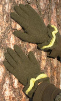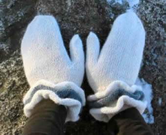 Lanka ja langan menekki Drops Alpaca, pääväriä 100 g. Korostusväriä noin puoli kerää. Kuvissa on käytetty sormikkaissa sävyjä 7895 (tummanvihreä) ja 7300 (vaaleanvihreä) ja lapasissa sävyjä 0100 (luonnonvalkoinen) ja 7139 (siniharmaa). Neuletiheys Noin 29 s ja 38 krs = 10 cm Puikot Sukkapuikot 2,5 mm tai käsialan mukaan. Samankokoinen pyöröpuikko tai toiset sukkapuikot silmukanpidikkeeksi. Jos suuren silmukkamäärän käsitteleminen sukkapuikoilla tuntuu vaikealta, voi työn myös aloittaa pyöröpuikoilla Koko Naisen M/L, kämmenen ympärys noin 18-20 cm. OhjeSormikas ja lapanen neulotaan aluksi samoin, joten ranteen ja peukalokiilan sekä peukalon ohjeet ovat samat molemmille käsineversioille. Lapasen kärkeen sekä sormikkaan sormiosaan on erilliset ohjeet. Ranne Luo päävärillä 96 s ja yhdistä pyöröneuleeksi. Neulo 4 krs ainaoikeinneuletta (pyöröneuleessa 1. ja 3. krs oikein ja 2. ja 4. krs nurin) ja jatka sitten sileää neuletta, kunnes kappaleen korkeus on 3,5-4 cm. Neulo seuraavalla kerroksella *2 o yhteen*, toista *-*. Jokaiselle puikolle jää 12 s. Neulo 1 o - 1 n -joustinta 2 cm ja siirrä silmukat pyöröpuikolle odottamaan. Luo korostusvärillä 96 s ja neulo kuten ensimmäistä röyhelöä kunnes ole kaventanut työn 48 silmukkaan. Seuraavalla kerroksella yhdistä kappaleet. Aseta työssä oleva puikko sekä silmukanpidikepuikko vierekkäin niin, että päävärillä oleva kappale jää taakse, eli uuden röyhelön alle. Yhdistä kappaleet 1 o - 1 n -joustinta neuloen. Kappaleiden yhteen neulomisen periaate on samankaltainen kuin kolmen puikon päättelyssä, eli varsinaisen puikon ja silmukanpidikepuikon silmukat neulotaan yhteen. Vedä siis aina lanka sekä päävärisen että korostusvärisen röyhelön silmukan läpi käsitellen näitä kuin yhtä silmukkaa. Älä kuitenkaan päätä silmukoita. Kun olet yhdistänyt kappaleet, jatka joustinneuletta päävärillä 2 cm ja siirrä silmukat jälleen pyöröpuikolle odottamaan. Luo päävärillä 96 s ja neulo vielä yksi röyhelö. Yhdistä kavennuksen jälkeen ranneosaan samoin kuin yllä. Jatka joustinneuletta vielä 2 cm tai kunnes ranne on halutun mittainen. Neulo vielä 5 krs sileää neuletta ja aloita sitten peukalokiila. Peukalokiila vasempaan käsineeseen Neulo sileää, kunnes 1. puikolla on jäljellä 4 silmukkaa. Lisää 1 s neulomalla silmukoiden välinen lanka kiertäen, neulo 3, lisää taas 1 s ja neulo kerros loppuun. Neulo 2 kerrosta sileää ja tee seuraavalla kerroksella peukalokiilan lisäykset, tällä kertaa siten, että lisäysten väliin jää 5 s. Jatka neuloen aina kaksi välikerrosta ennen seuraavaa lisäyskerrosta, kunnes peukalokiilassa on lisätyt silmukat mukaan lukien 15 s. Neulo vielä 3 krs sileää ja ota sitten peukalokiilan silmukat apulangalle odottamaan. Peukalokiila oikeaan käsineeseen Peukalokiila neulotaan, kuten vasemmassa kämmenessä, mutta sijoitetaan käsineen toiseen laitaan: Neulo sileää, kunnes olet neulonut 4. puikolta yhden silmukan. Lisää 1 s neulomalla silmukoiden välinen lanka kiertäen, neulo 3, lisää taas 1 s ja neulo kerros loppuun. Jatka peukalokiilaa ylläolevien ohjeiden mukaan, ja neulo myös kämmen kuten vasemmassa käsineessä. Lapasen kärki Luo peukalokiilan silmukoiden tilalle 3 s ja jatka sileää neuletta, kunnes lapanen on noin 3 cm haluttua valmista mittaa lyhyempi. Neulo kavennukset aina yhden silmukan päässä puikon päästä seuraavasti: Neulo kunnes 1. puikolla on jäljellä 3 s, neulo 2 s takareunoista oikein yhteen ja 1 s oikein. Neulo 2. puikolta 1 s, neulo 2 s oikein yhteen ja jatka oikeaa kunnes 3. puikolla on jäljellä 3 s. Neulo jälleen 2 s takareunoista oikein yhteen ja 1 s oikein. Neulo vielä 4. puikolta 1 s, neulo 2 s oikein yhteen ja jatka kerros loppuun. Toista kärkikavennukset joka 2. krs kunnes jokaisella puikolla on jäljellä 7 s, sitten joka krs kunnes silmukoita on jäljellä yhteensä 8. Katkaise lanka, vedä langan pää silmukoiden läpi ja kiristä lapasen kärki kiinni. Kärki on samanlainen sekä vasemmassa että oikeassa lapasessa. Vasen sormikas Luo peukalokiilan silmukoiden tilalle 3 s ja jatka sileää neuletta, kunnes käsine ulottuu pikkusormen tyveen. Neulo ensiksi pikkurilli. Jätä muut silmukat sukkapuikoille tai apupuikolle odottamaan, ja jatka työtä 3. puikon kuudella viimeisellä ja 4. puikon kuudella ensimmäisellä silmukalla. Luo vielä pikkurillin ja nimettömän väliä varten puikkojen väliin 3 s, jaa silmukat puikoille ja neulo pikkurilli näillä 15 silmukalla. Aloita kavennukset kuin sormi yltää kynteen asti, tai kun sormi on noin 0,5-1 cm verran haluamaasi valmista sormea lyhyempi. Kavenna tasavälein kolmessa kohtaa neulomalla 2 oikein yhteen. Jatka kavennuksia joka kerroksella, kunnes jäljellä on 3 s. Katkaise lanka ja vedä langan pää silmukoiden läpi. Poimi pikkurillin juuresta 3 s ja neulo näillä sekä kaikilla odottavilla silmukoilla 2 krs. Ota odottavista silmukoista nimettömän neulomista varten seuraavat 5 s kämmenpuolelta, pikkurillin juuren 3 s sekä 5 s kädenselän puolelta puikoille. Luo puikkojen väliin toiselle puolelle nimettömän ja keskisormen väliä varten 5 s, jaa silmukat puikoille ja neulo nimetön näillä 18 silmukalla sopivan mittaiseksi, ja tee kavennukset tasavälein samoin kuin pikkurillille. Ota keskisormea varten odottavista silmukoista kädenselän puolelta taas 5 s, poimi 5 s nimettömän juuresta ja ota kämmenpuolella odottavista silmukoista 5 s. Luo puikkojen väliin vielä keski- ja etusormen väliä varten 3 s. Neulo keskisormi näillä 18 silmukalla sopivan mittaiseksi, ja tee kavennukset tasavälein samoin kuin yllä. Ota etusormea varten työhön jäljelle jääneet 16 s ja poimi lisäksi keskisormen juuresta 3 s. Neulo etusormi näillä 19 silmukalla sopivan mittaiseksi, ja tee kavennukset tasavälein samoin kuin yllä, kunnes jäljellä on 4 s. Oikea sormikas Neulo kuten vasen sormikas, mutta peiliku