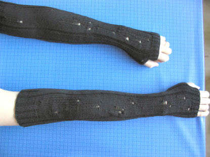 Lanka ja langan menekki Novita Tennesee (100% merseroitu puuvilla, 100 g = n. 214 m), 200 g, musta (099) Neuletiheys 22 s ja 29 krs sileää neuletta = 10 cm Puikot Sukkapuikot, 3 mm tai käsialan mukaan Koko Hihan koko pituus 60 cm, pituus ranteeseen 50 cm, ympärysmitta yläreunassa 28 cm, ympärysmitta ranteessa 15 cm OhjeOhje on kirjoitettu oikeakätiselle neulojalle. Kerroksen vaihtumiskohta on kämmenen ulkosyrjällä Vasen Luo 64 s ja jaa silmukat neljälle puikolle (4 x 16 s). Neulo suljettuna neuleena 2o‑2n ‑joustinneuletta 20 krs (n. 7 cm). Neulo *6 oikein – 2 nurin* ja toista *_* vielä 4 kertaa (olet kolmannan puikon keskellä). Neulo nyt 14 oikein, 2 nurin ja vielä kerran 6 oikein, 2 nurin (toivoakseni olet nyt olet 4. ja 1. puikon välissä). 3. puikon keskeltä 4. puikon keskivaiheille muodostuu (alussa 14 s leveä) ns. kuviokaitale. Neuleen edetessä tee kuviokaitaleeseen sinnetänne silmäpakoja alla olevan ohjeen mukaan. Neulo jatkossa muualla oikea silmukka oikein ja nurja nurin. Oikea Neulo kuten vasen, mutta tee kuviokaitale 1. puikon keskeltä 2. puikon keskelle ja kavennukset aina oikein neulotun pystyraidan etureunaan neulomalla kaksi silmukkaa oikein yhteen. Silmäpako Kavenna 1 s valitsemallasi tavalla ja ota langankierto puikolle. Seuraavilla kerroksilla neulo langankierto normaalisti oikein. Kun olet neulonut riittävän määrän kerroksia ja olet kohdassa, jossa langankiertoon neulottu silmukka on ensimmäisenä vasemmalla puikolla, pudota silmukka vasemmalta puikolta (ole tarkkana, ettet pudota väärää silmukkaa, jottei silmukka purkaudu alkuun asti). Ota langan kierto puikolle pudotetun silmukan tilalle ja neulo se jatkossa normaalisti oikein. Voit tehdä silmäpakoja myös muutaman silmukan levyisinä. Kannaattaa kuitenkin muistaa, että silmäpako on jonkin verran leveämpi kuin normaali silmukka. Viimeistely Virkkaa peukaloreiän ympäri 16 kiinteää silmukkaa. Päätele langan päät. Venytä silmäpakoja ja kiristä silmäpaon viereisiä silmukoita tarvittaessa. Hihan yläreunaan voit pujottaa kapean kuminauhan, jos reuna tuntuu löysältä. VinkkejäEpäsäännöllisten silmäpakojen sijaan voit neulon hihan kuviokaitaleeseen tiheyteen sopivan pitsi- tai pintaneuleen. Voit koristella kuviokaitaleen viimeistelyvaiheessa myös vaikka värikkäällä kirjailulla, helmillä tai paljeteilla käyttötarkoituksen mukaan.