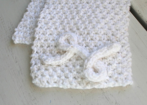 hintaa Yhdestä kerästä syntyy lapsen kaulahuivi. Kuvan huivi on kahden kerroksen helmineuletta ja sen koristeeksi on ommeltu i-cordista muotoiltu kuvio.