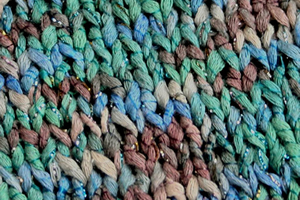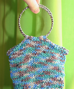 Päättely oli hankalaa, koska langanpäät piti tarkasti pujotella lankojen välistä. Jos neula eksyi langan keskelle, langan ympäri tiukasti kiedottu säie piti huolen siitä, että neula jumi siihen. Testaaja kiitti: kaunista värimaailmaa Pikkulaukku on neulottu putkena sukkapuikoilla. Kirpputorilta löytyneet rannerenkaat on kiinnitetty kahvoiksi virkkaamalla kiinteillä silmukoilla. Yläreunoja ei ole huoliteltu ja ne saavatkin rullautua sivusta.