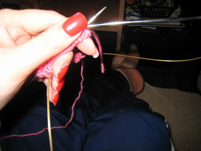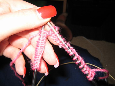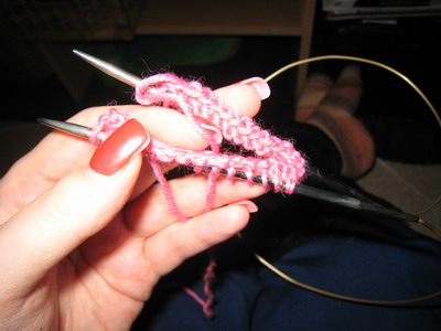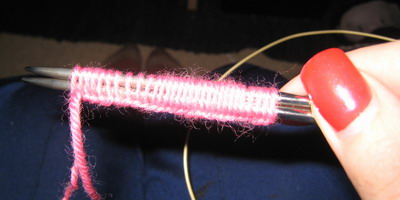 Neulo puikolla oleva silmukkaryhmä. Muista kiristää lankaa kerroksen alussa, ettei yhdistämiskohtaan jää pitkää langanjuoksua. Kun olet neulonut silmukkaryhmän, olet jälleen samassa tilanteessa kuin tämän kohdan alussa. Siirrä taas silmukat vapaana olevan vasemman käden puikon kärkeen ja muodosta lenkki myös neuleen oikealle puolelle. Neulo seuraava silmukkaryhmä. Toista yllä kuvattuja vaiheita