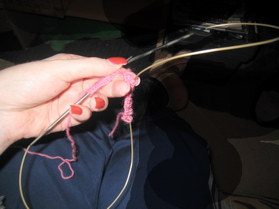Neulo silmukkaryhmä kerrallaanKun olet neulonut kerroksen loppuun, vasemman käden puikko on vapaa. Siirrä taemman eli seuraavaksi vuorossa olevan silmukkaryhmän silmukat puikon kärkeen. Nyt neuleen vasemmalla puolella on pyöröpuikon kaapelin muodostama lenkki. Vedä sen jälkeen oikean käden puikkoa niin, että pyöröpuikon kaapeli muodostaa lenkin myös neuleen oikealle puolille. Katso, että lenkissä on tarpeeksi väljyyttä, että voit jatkaa neulomista, mutta älä vedä liikaa, ettei vasemmanpuoleinen lenkki katoa. Jatka neulomista ja yhdistä neule pyöröneuleeksi.