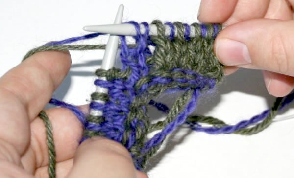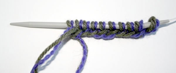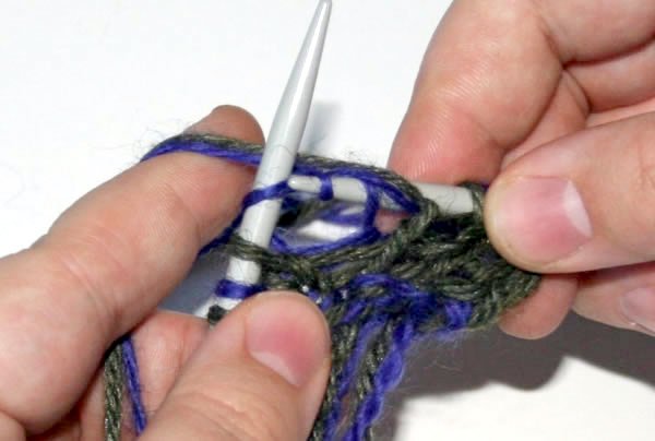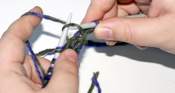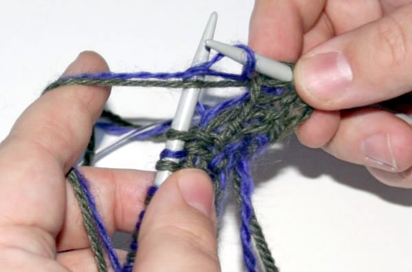 Neulo seuraava silmukka nurin eri langalla kuin äskeinen silmukka. Pidä molemmat langat neulottavan silmukan etupuolella.