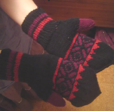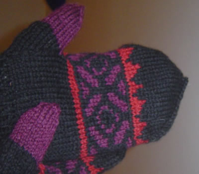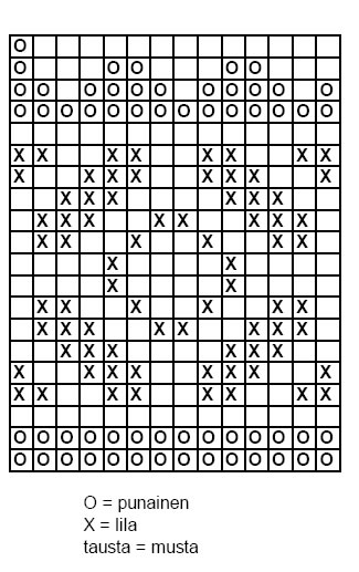 Tummasävyiset Alice -lapaset on nimetty Liisa ihmemaassa -kirjan Alicen goottilaisen kaksoissisaren mukaan. Lapasissa on latvialaisista kirjoneulelapasista vaikutteita saanut etninen koristekuvio. Lanka ja langan menekki Gjestal Maija, 50 g, musta (kerä kului lähes kokonaan, joten jos epäilet langan riittävyyttä, osta kaksi kerää) Gjestal Maija, 50 g, lila Gjestal Maija, 50 g, punainen Kotimaisina lankavaihtoehtoina käyvät Novitan Nalle tai Florica Neuletiheys 23 s ja 28 krs = 10 cm Puikot 3 mm sukkapuikot tai käsialan mukaan Muut tarvikkeet Apupuikko, lankaa tai hakaneula peukalon silmukoiden pidikkeeksi Koko Nainen Mallineule Ks. kaavio ohjeen lopusta OhjeLuo 56 silmukkaa mustalla langalla. Jaa silmukat neljälle pienemmälle sukkapuikolle (14 kullekin) ja neulo suljettuna neuleena 8 kerrosta 1 o, 1 n -joustinneuletta. Neulo joustinta tämän jälkeen 4 kerrosta lilalla, 2 kerrosta mustalla, 4 kerrosta punaisella, ja lopuksi mustalla, kunnes joustimen korkeus on 9 cm. Vaihda työhön isommat puikot. Neulo mustalla 4 krs sileää ja aloita viidennellä kerroksella peukalokiila. Peukalokiila neulotaan oikean käden lapaseen 2. puikon alussa, vasemman käden lapaseen 3. puikon keskellä. Oikean lapasen peukalokiilaNeulo 2. puikolta 1 s oikein. Lisää 1 s nostamalla silmukoiden välinen pohjukkalanka puikolle ja neulomalla se takareunasta oikein. Neulo 1 s oikein, ja tee toinen lisäys samalla tavalla. Neulo kierros loppuun ja tee lisäykset jatkossa joka toinen kerros. Seuraavalla lisäyskerroksella neulo 1 s oikein, lisää 1 s kuten aiemmin, neulo 3 s oikein, tee toinen lisäys, ja neulo kerros loppuun. Jatka samalla tavalla, kunnes lisäysten välissä on 13 s, eli puikolla on yhteensä 28 silmukkaa. Siirrä peukalokiilan silmukat apupuikolle, langalle tai hakaneulalle, ja neulo 1 krs mustalla lisäten samalla peukalokiilan kohdalle 1 s neulomalla 1 s peukalokiilan silmukoiden jälkeen sekä etu- että takareunastaan oikein. Näin kaikilla puikoilla on taas 14 s. Vasemman lapasen peukalokiilaNeulo 3. puikolta 7 s oikein. Tee lisäykset tähän kohtaan samalla tavalla kuin oikeaankin lapaseen. Lapasen kämmenosa ja kärkiNeulo peukalokiilan jälkeen yksi kerros mustalla ja aloita kuvioneule kaavion mukaisesti. Kun kuvio on valmis, jatka mustalla, kunnes lapasta sovittaessasi pikkusormi jää piiloon. Aloita sen jälkeen kärkikavennukset: kavenna joka kerroksella 1. ja 3. puikon lopussa ja 2. ja 4. puikon alussa 1 s. Tee kavennukset puikon lopussa neulomalla 2 silmukkaa yhteen ja puikon alussa ylivetokavennuksina. Kun silmukoita on jäljellä enää 4 eli 1 kullakin puikolla, vedä lanka silmukoiden läpi ja päättele nurjalle puolelle. PeukaloSiirrä peukalokiilan 15 s kolmelle puikolle niin, että 1. puikolla on 6, toisella 6 ja kolmannella 3 s. Poimi lilalla langalla kolmannelle puikolle 4 silmukkaa lisää peukaloaukon ympäriltä. Neulo peukaloa neljällä puikolla suljettuna neuleena, kunnes peukaloasi näkyy sovittaessa aukosta vain vajaa sentti. Aloita kavennukset: kavenna kahdella kerroksella joka puikon alussa 1 s neulomalla kaksi ensimmäistä silmukkaa yhteen takareunastaan. Seuraavalla kerroksella älä tee kavennuksia lainkaan 1. ja 2. puikolla, vaan vain kolmannella; näin joka puikolla on sama määrä silmukoita (4). Jatka nyt kavennuksia joka puikon alussa, kunnes silmukoita on jäljellä enää 6 eli 2 kullakin puikolla. Katkaise sitten lanka ja vedä se kaikkien silmukoiden läpi, vedä kireälle ja päättele. Päättele lopuksi muutkin langanpäät. Kaavio