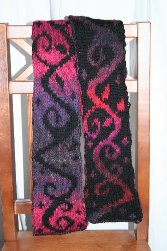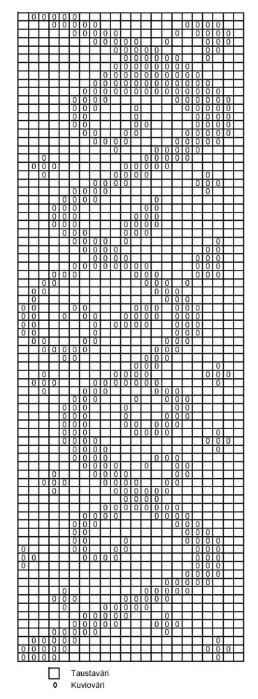Höngi kuin lohikäärme, vaella kuin yksinäinen ritari metsissä, lumoa niinkuin velho ja ole kaunis kuin prinsessa. Hönkä-huivin mallineule kuvastaa lämmintä magian höngähdystä, kaarretta ja pientä elämän versoa lehtineen ja tuikkeineen. Lanka ja langan menekki Noro Kureyon, 100 g, väri 124 Florican voit korvata esimerkiksi yksinkertaisella Smart-langalla. Neuletiheys 17 s = 10 cm Puikot 3 mm puikot tai käsialan mukaan Koko Leveys 14 cm ja pituus 130 cm. Voit helposti neuloa huivista pidemmän jatkamalla neuletta, mutta saatat tarvita enemmän lankaa. Onteloneuleinen huivi on paksu, joten sitä ei tarvitse kietoa kaulan ympäri monesti. Mallineule Ks. kaavio ohjeen lopusta OhjeLuo 22 s käyttäen kahta säiettä Floricaa ja yhtä säiettä Kureyonia. Luomisen jälkeen jokainen silmukka muodostuu kolmesta lankalenkistä. Neulo yksi kerros yksivärisenä onteloneuleena aloittaen neulomalla Kureyonista muodostuvat lankalenkit Kureyonilla oikein ja kaksinkertaisella Floricalla kaksinkertaiset Florica-silmukat nurin. Aloita onteloneule mallineuleen mukaan. Mallineule on 77 krs korkea. Kun olet neulonut mallineuleen kerran, aloita se uudestaan alhaalta. Katso myös Onteloneule-ohje. Kuvan kaulaliinassa on 2,5 mallineulekertaa. Neulomalla esimerkiksi kolme mallineulekertaa saat noin 150 cm pitkän huivin. Päättele huivi neulomalla molempien puolien silmukat yhdessä (22 s). Neulo vuorotellen kaksi silmukkaa (musta ja punainen) yhteen ja päättele yhteen neulotut silmukat tavallisesti ylivetämällä.
