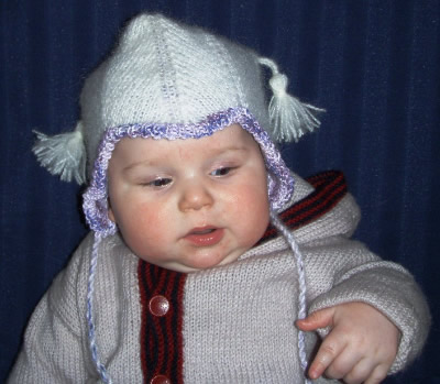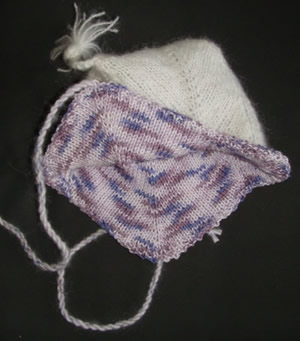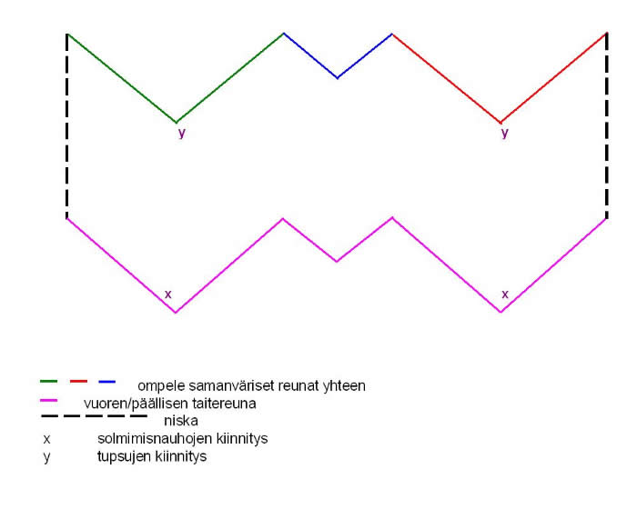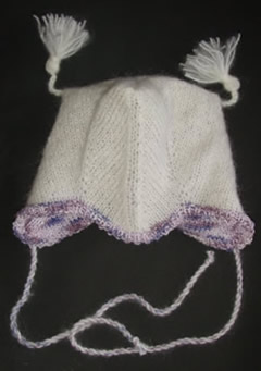 Toisin kun perinteinen poikittain neulottu kypärämyssy, tämä myssy neulotaan ylhäältä alaspäin... ja takaisin ylös. Lumipallo on vuorellinen kypärämyssy, joka neulotaan yhtenä kappaleena. Vuori on iholle ystävällistä puuvillaa ja päällinen pörröistä mohairlankaa. Lanka ja langan menekki NO2 puuvillalanka 50 g/125 m, lilakirjava (7) Baronesse Mohair 50 g/165 m, valkoinen (1010) Neuletiheys 22 s = 10 cm Puikot Lyhyet pyöröpuikot tai sukkapuikot 3,5 mm tai käsialan mukaan Koko 3-6 kk lapselle, valmiin myssyn päänympärys 43-44 cm 12-18 kk lapselle, valmiin myssyn päänympärys 47-48 cm Mallineule Ks. kaavio ohjeen lopusta OhjeVuoriAloita myssy neulomalla vuori. Luo puuvillalangalla 109 - 119 s. Jos käytät sukkapuikkoja, jaa silmukat puikoille seuraavasti: 42, 25, 42 - 46, 27, 46. Neulo 2 kerrosta oikein ja aloita sen jälkeen mallineule: 1 silmukka oikein, 2 silmukkaa oikein yhteen, 18-20 silmukkaa oikein, lk, 1 silmukka oikein, lk, 18-20 silmukkaa oikein, 3 silmukkaa oikein yhteen, 9-10 silmukkaa oikein, lk, 1 oikein (keskikohta), lk, 9-10 silmukkaa oikein, 3 silmukkaa oikein yhteen, 18-20 silmukkaa oikein, lk, 1 silmukka oikein, lk, 18-20 silmukkaa oikein, 2 silmukkaa oikein yhteen, 1 oikein. Seuraavalla kerroksella neulo kaikki silmukat oikein, paitsi neulo langankierrot kiertäen oikein. Jatka mallineuletta 15-17 cm. ReunusJatka neulomalla reunus. Neulo puuvillalangalla 6 krs 1 o 1 n -joustinta, neulo 1 kerros nurin (kääntökohta), ja neulo vielä 6 kerrosta joustinta. PäällinenNeulo seuraavaksi päällinen mohairlangalla. Neulo 1 kerros oikein ja jatka seuraavalla mallineuleella: 1 silmukka oikein, lk, 18-20 silmukkaa oikein, 3 silmukkaa oikein yhteen, 18-20 silmukkaa oikein, lk, 1 silmukka oikein, lk, 9-10 silmukkaa oikein, 3 silmukkaa oikein yhteen, 9-10 silmukkaa oikein, lk, 1 simukka oikein, lk, 18-20 silmukkaa oikein, 3 silmukkaa oikein yhteen, 18-20 silmukkaa oikein, lk, 1 silmukka oikein. Seuraavalla kerroksella neulo kaikki silmukat oikein, paitsi neulo langankierrot kiertäen oikein. Jatka mallineuletta 15,5-17,5 cm. Päätä silmukat. Taita vuori nurjan kerroksen kohdalta sisäänpäin. Ompele vuorin ja päällisen saumat erikseen kuten kaaviossa näkyy. Kiinnitä solmimisnauhat ja tupsut. |