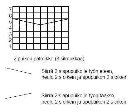 - Neulo 2. puikolla palmikonkierrot: siirrä 2 s apupuikolle työn
