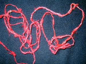 Ensimmäinen kosketus lankaan oli positiivinen. Mattapintainen lanka näytti houkuttelevalta ja lanka tuntui pehmeältä ja joustavalta, ei mitenkään puuvillamaisen kovalta. Myös punainen väri oli kaunis ja täyteläinen.