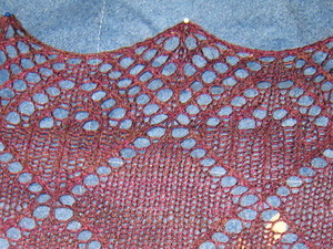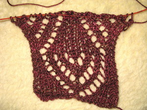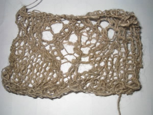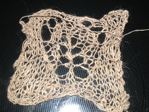 Neuloessa lanka on kovaa, joustamatonta ja karkeaa. Se taipuu kuitenkin melko hyvin pitsineuleeksi ja silmukat erottuvat hyvin, neulepinta on kuitenkin hieman epätasaista. Neuloessani pohdiskelin, että virkkaamalla nokkoslangasta saisi hyvinkin jämäkkää jälkeä tai että nokkoslanka sopisi hyvin kangaspuilla kutomiseen tai vaikkapa makrameehen.