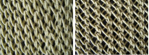 Kuvassa vasemmalla on ylläolevan kaulaliinan pinta täysin rentona ja oikealla hiukan avattuna. Tämä kaulaliina on neulottu 5,5 mm puikoilla langasta, jolle suositellaan 3,5 - 4,5 mm puikkoja. Tulos on jo melko ilmava: sormi mahtuu läpi neuloksen rei'istä.