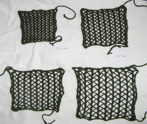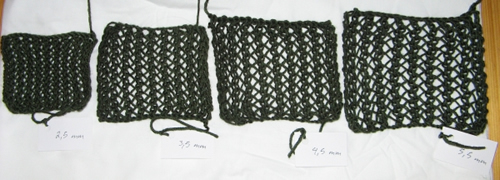 Kuvassa on neulottu (vasemmalta lukien) 2,5 mm, 3,5 mm, 4,5 mm ja 5,5 mm puikoilla lankaa, jolle suositellaan 3,5 – 4,5 mm puikkoja. Kussakin tilkussa on 20 silmukkaa. Tilkut on kasteltu ja levitetty, mutta ei pingotettu.