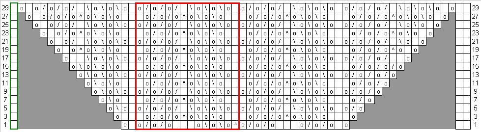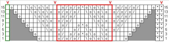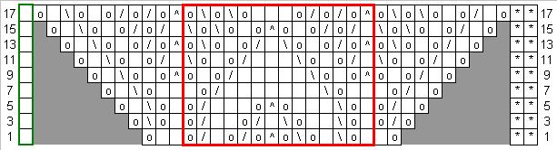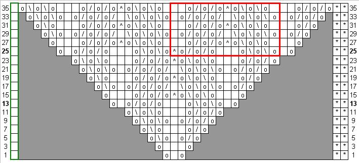 Silmukkamäärä lisääntyy jokaisella oikealla kerroksella neljällä silmukalla paitsi kaavion 1 kerroksilla 15, 25, 37... silmukat lisääntyvät kahdeksalla silmukalla.