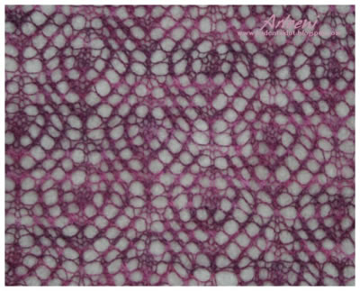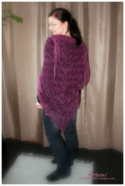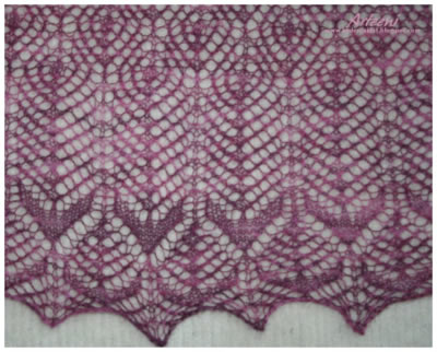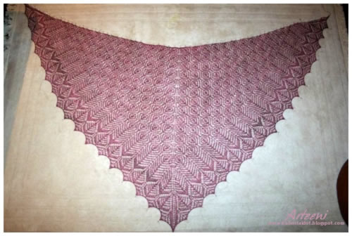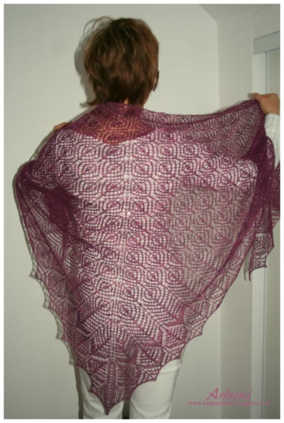 Huivin silmukat lisääntyvät jonkin verran perusmallineuleen kohdalla, joten huivin voi pingoittaa kuvan mukaisesti hiukan kaarevaksi.