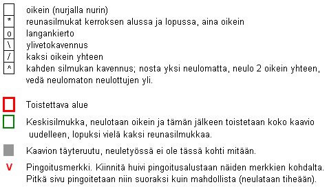 Neulo kaavion 1 ensimmäisen rivin mukaisesti 2 o, lk, 1 o, lk, 1 o, lk, 1 o, lk, 2 o. Jatka kaavion mukaan (huomaa, että kaaviossa on vain huivin toinen reuna keskisilmukkaan asti, keskisilmukan jälkeen neulo mallineule uudelleen ja lopuksi vielä kaksi reunasilmukkaa). Kaavioihin on merkitty vain oikeat kerrokset (kaavion parittomien numeroiden rivit), neulo nurjat kerrokset (parilliset rivit) nurin kahta ensimmäistä ja kahta viimeistä silmukkaa lukuunottamatta.