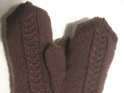 Jatka joustinneuletta, kunnes resori on 10 cm pitkä. Neulo sen jälkeen yksi kerros oikein. Tämän jälkeen aloita palmikkokaavio 1. ja 2. puikoilla. Aloita samaan aikaan peukalokiila, vasemmassa lapasessa se tulee neljännen puikon loppuun. Neulo 7 silmukkaa, nosta sitten silmukoiden välinen pohjukkalanka puikolle ja neulo se takareunasta oikein, neulo yksi silmukka ja toista lisäys. Neulo lisäys 5 kertaa joka kolmannella kerroksella, jolloin kiilassa on 11 silmukkaa ja jätä sen jälkeen peukalokiilan silmukat apulangalle odottamaan. Luo tilalle yksi silmukka tai tee lisäys neulomalla silmukka sen etu- ja takareunasta ennen kiilakohtaa tai sen jälkeen.