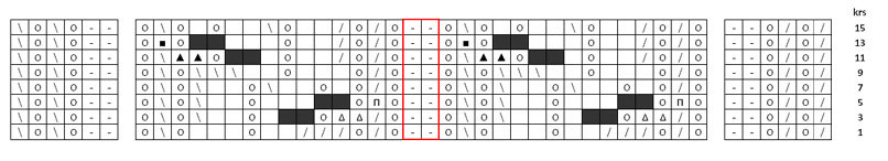 Huomaa, että kaavioon on merkitty vain oikean puolen kerrokset. Nurjalla puolella neulo jokaisen kerroksen kuusi ensimmäistä ja kuusi viimeistä silmukkaa oikein ja loput nurin lukuun ottamatta kahden silmukan levyistä nurjaa raitaa huivin keskellä (merkitty kaavioon punaisella).