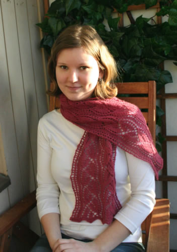Kanerva-huivi sai nimenlangan värin mukaan. Kellokukkamainen mallineule on peräisin Big Book of Knitting Patterns –mallikokoelmasta.