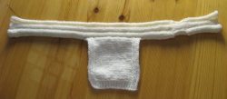 Kun läpän korkeus on 10 cm (Mitta C - 1 cm), neulo viimeiset 5 kerrosta aina oikein. Viimeisellä, kohti joustinneuletta menevällä kerroksella päättele läpän 24 silmukkaa.