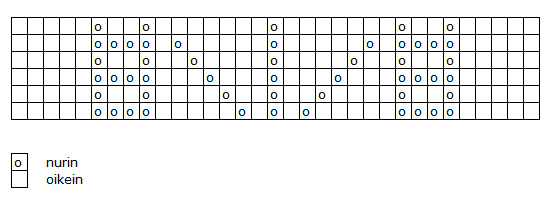Neulo 1. ja 4. puikoilla sileää ja aloita 2. ja 3. puikoilla kaavion mukainen mallineule.