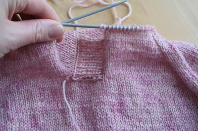 Tsee etukappaleen nappilistahalkio. Voit valita etukappaleeksi kumman puolen tahansa, koska tässä vaiheessa kappaleet ovat vielä symmetriset. Neulo etukappaletta 24 s, päätä sen jälkeen 6 s ja jatka normaalisti koko oikea kerros (kavennuksien kera), kunnes tulet pääteltyjen silmukoiden kohdalle uudelleen.