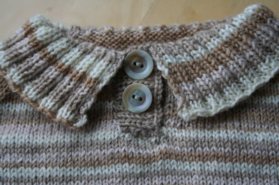Poimi myös halkion toisesta reunasta 14 silmukkaa ja neulo samoin 1 o, 1 n- joustinneuletta. Neulo 2 cm ja tee napinlävet 2 ja 8 silmukan päähän reunasta: lk ja neulo 2 o yhteen). Neulo kaitale 3 cm leveäksi, päättele silmukat. Ompele kaitaleet alareunoistaan kiinni. Ompele napit.