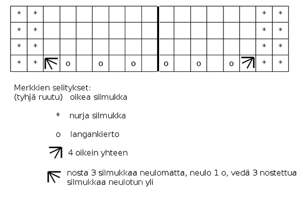 17 silmukan mallineuleen leveys 7,5 cm; 24 krs = 10 cm