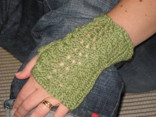 Pia Tuonosen Nukkumaijan unisukissa (Ulla 01/05) on kaunis pitsikuvio, jota käytetään pikkuriikkisen muunneltuna näissä helpoissa, mutta hyvin istuvissa ranteenlämmittimissä. Ranteenlämmittimissä on peukalokiila, muttei peukaloa, ja kämmenosa loppuu rystysiin, jolloin se ei haittaa esim. tietokoneen käyttöä.