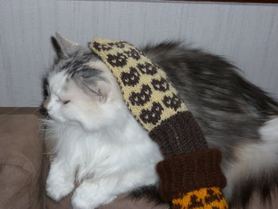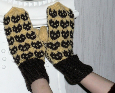 Seuraavalla kerroksella neulo kämmenpuolen kirjoneuletta niin, että neulot edellisen kerroksen keltaiset silmukat ruskealla ja ruskeat silmukat keltaisella. Näin kämmenpuolelle muodostuu kirjoneuleruudukkoa. Jatka kissakuvioita kaavion mukaan.