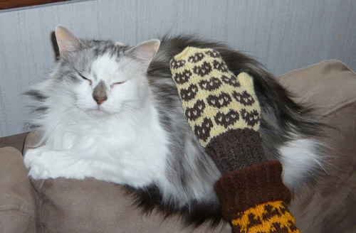 Kissoista muodostuikin omaan tyylini sopivan naiivit ja hauskat, toivottavasti ne miellyttävät myös muiden silmää. Resorit neuloin pitkiksi valepalmikkojoustinneuleella, joten kissat eivät jätä ranteitakaan kylmiksi.