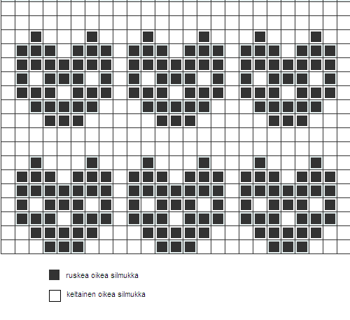 - 1.krs: neulo *2 oikein, 1 nurin*. Toista *-* kerroksen loppuun.