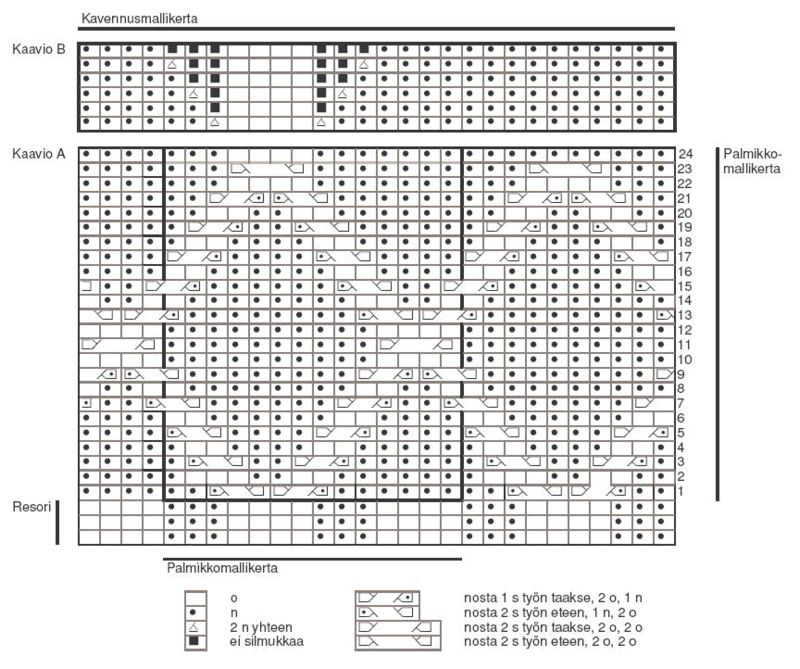 Aloita kavennukset kaavion B mukaisesti – neulo joka toisen palmikonkierron kohdalla nurjaa ja jatka joka toista oikein silmukoin päälaelle asti ja kavenna nurjia silmukoita oikeiden vierestä. Jatka kavennuksia, kunnes nurjia silmukoita on joka välissä jäljellä yksi. Neulo yksi kerros ja kavenna oikeiden silmukoiden kohdalla kaksi kertaa 2 o yhteen. Seuraavaksi kavenna nurjia silmukoita reunustavat oikeat silmukat nurjien kanssa; nosta oikea silmukka, neulo nurja ja oikea silmukka oikein yhteen, ja vedä nostettu silmukka neulotun yli.