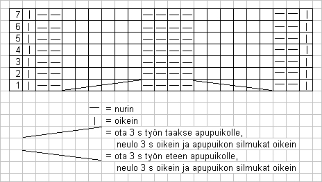 Neulo 2. ja 3. puikolla kaavion mukaan ja muilla puikoilla sileää oikeaa. Neulo palmikon silmukat välikerroksilla oikein.