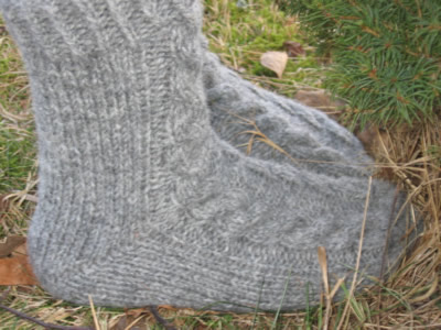 Neulo kaavion mukaan, kunnes sukka ulottuu nilkan pokkulaluun puoliväliin. Neulo sitten tiimalasikantapää 22 silmukalla (ohje Ulla 01/04), jaa silmukat tiimalasikantapäätä varten 7 - 8 - 7. Jatka kantapään jälkeen palmikkoneuletta sukan etupuolella ja neulo takana sileää oikeaa, kunnes varsi on haluamasi pituinen. Neulo sitten 10 krs 1 o, 1 n-joustinta kierrettynä ja päättele silmukat löyhästi.