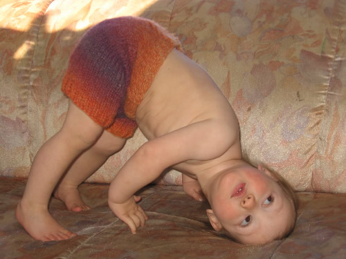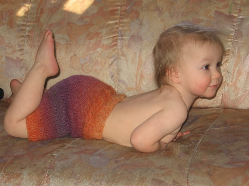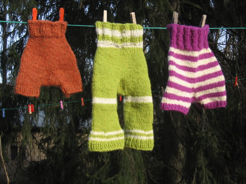 Päättele langanpäät ja ompele umpeen lahkeen ja haarakiilan väliin mahdollisesti jäänyt reikä. Pue pöpät lapsellesi ja juo kuppi kahvia. Vaihda vaippa ja neulo uudet pöpät.