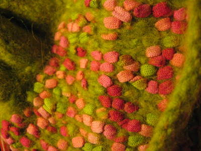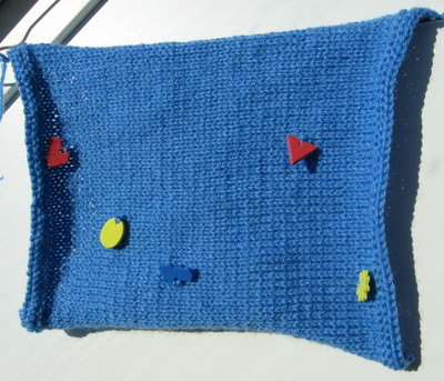 Langan ollessa vielä vyyhdillä vaikutti koristeita olevan huomattavasti enemmän. Valmiissa neulepinnassa autot, soikiot, kolmiot ja kukat ovat mielestäni turhan harvassa. Koristeet on lisäksi nimenomaan solmittu lankaan eikä millään tapaa pujotettu säikeisiin. Neuloessa tilkkua tuli mieleeni, että tämän verran muovikoristeita voisi hyvin itsekin lankaan solmia ja samalla saisi ne tismalleen haluamilleen kohdille.