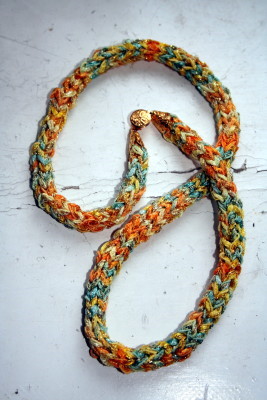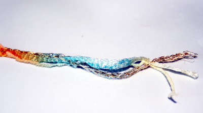 Kokeiluna neuloin langasta i-cordina kaulakorun ja lisäksi mallitilkun. Langan neulominen tuntui hieman karhealta kultaisen säikeen vuoksi ja löyhä kierre aiheutti hieman langan tarttumista puikkoon kun puikon kärki meni läpi langan säikeiden välistä. Langassa on yksi leveä nauhalankasäie, yksi pehmeä ja ohut säie, ja yksi kultainen säie. Langan halkeilua lukuun ottamatta lanka juoksi kerältä mukavasti ja neuletta syntyi vauhdikkaasti.
