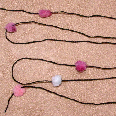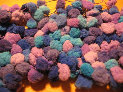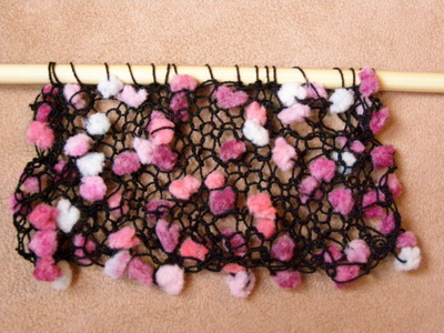 Neuloin lankaa sekä yksinään että yhdessä mustan Novitan 7 veljeksen kanssa. Neulominen on helppoa ja sujuvaa – ainoa ongelma oli, että kerältä tullessaan pompulat tarttuivat helposti toisiinsa ja menivät solmuun. Vaikka lankaa ohjeistetaan neulomaan yhdessä toisen langan kanssa, voisi tätä mielestäni käyttää myös yksin koristeena tai jopa ohuena huivina. 7 veljeksen kanssa neulottuna neulepinta on leikkisää ja mielenkiintoista. Pienellä suunnittelulla pallerot on mahdollista saada suurimmaksi osaksi neuleen oikealle puolelle. Mallitilkun jälkeen tekee mieli neuloa tätä lisää!