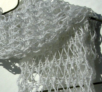 Neuloin testihuiviin pidennettyjä silmukoita, mutta ne aukeavat näin nyppyisessä langassa kehnosti. Pidennettyjä silmukoita joutui erikseen käsin avaamaan kun nypyt jäivät kiinni vääriin väleihin. Valmiin huivin ulkonäkö on hyvin muovinen, mutta ehkäpä esimerkiksi pikkujouluasusteeksi sopiva. Allergikolle lanka voisi olla vaihtoehto juhlavaan huiviin, mutta sittenkin hyvin epämukava neuletuntumaltaan. Käytössä huivi tuntuu kaulaa vasten yllättävän pehmeältä.