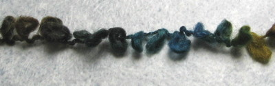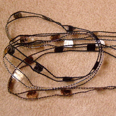 Voisin kuvitella käyttäväni i-cordina neulottua kaulakorua jopa juhlissa, sillä lanka on kohtuullisen hillittyä, mutta kuitenkin juhlavan kiiltävää. Harvempaan neulottu mallitilkku on hyvin joustava ja kimaltava ja neulepinta on selkeä ja sileä. Langasta voisi hyvin neuloa juhliin esimerkiksi boleron tai huivin. Lanka ei välttämättä sovi päiväjuhlien vaatteiden seuraksi, vaan nimenomaan kimaltavaksi asusteeksi iltatilaisuuksiin.